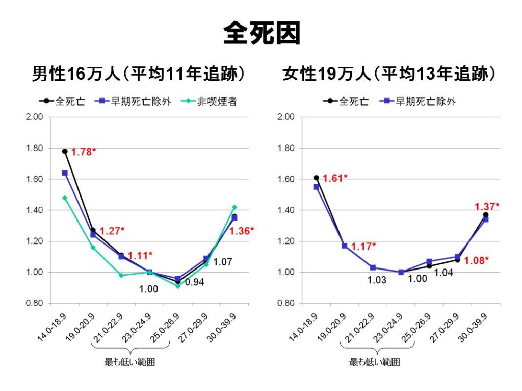 女性の全死因の中で死亡リスクが低いのはBMI21~26.9